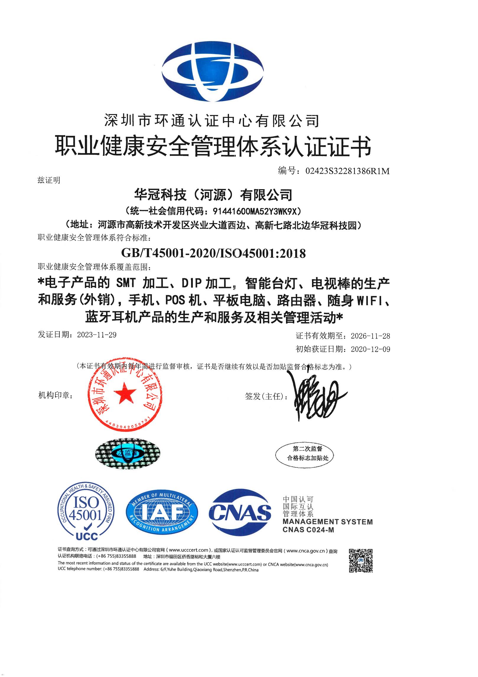 華冠ISO45001健康安全管理體系證書(中文)